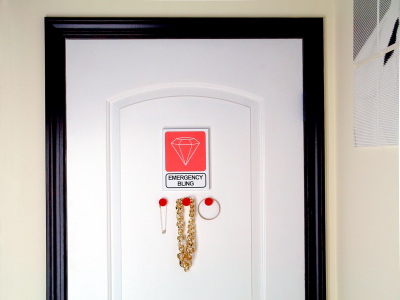 Emergency bling access points are critical to making sure you look good all the time under any circumstances. Hair caught on fire? No worries. Hit the "E-Bling" station and you'll look good as new (minus hair of course). The easy-to-install, non-permanent adhesive Stow Dots make it easy to set these up wherever we need them. (We actually have more E-Bling stations than fire extinguishers now.) (PIC 1-1)