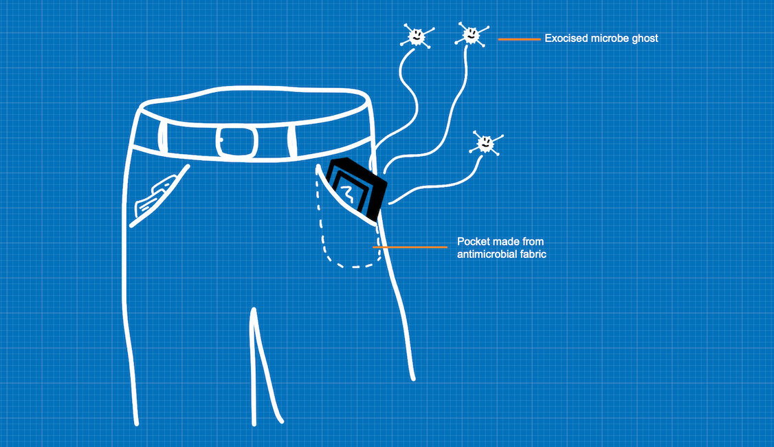 A simple pants modification to help fight the onslaught of microbes that collect on your goodies. Concept is easy to swap into existing pants manufacturing flows, or start your own "Antimicrobial Enhanced Pants" business by modding existing pants.
