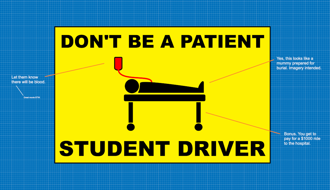 A different approach to those "Student Driver" signs. Devoid of soft language in order to leave an impact on the severity of the situation.