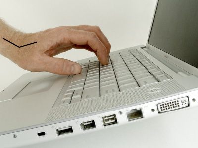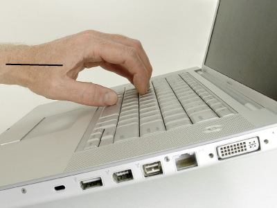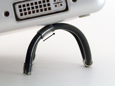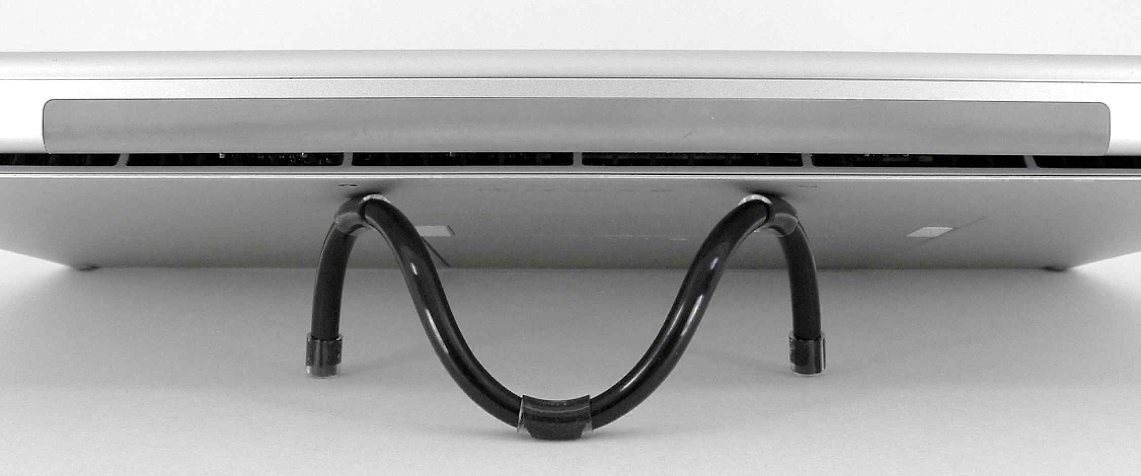 The first time you use the riser you should check that the bumpers are positioned correctly and the balance is good. Look at the side of the laptop. The two bumpers on the legs should contact the laptop in their center. (PIC 1-4) Now look at the back of the laptop. The three bumpers on the ends of the legs should evenly contact the table. (PIC 1-5) Open the Screen. Apply counter-pressure to the keyboard as you open the screen to prevent it from lifting off the table. (PIC 1-6) Play with the keys and trackpad. There shouldn’t be significant shift or wobble. If any of these are a problem, proceed to the Adjusting section to fix it. If all is good, make sure you read our Precautions before you head off to the coffee shop.