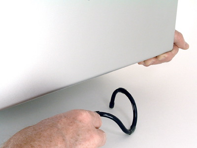 To widen the riser, set the riser on a table in front of you. Grab each leg with your hands. (PIC 2-8) In a slow, smooth motion stretch one of the legs apart while holding the other firmly in place. (PIC 2-9) Place your laptop onto the riser to see how it fits. Continue widening the riser until you feel the laptop is properly supported. You may have to adjust the legs and bumpers after this procedure. (PIC 2-10)