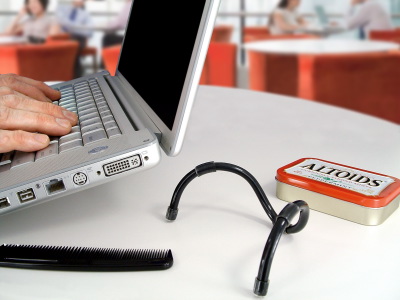 Set the mini riser on a flat surface. (PIC 1-1) Place your laptop on the riser so the riser is centered (use logo on the lid). The bend of the riser should stick out from the back a little (about 0.5 inch). (PIC 1-2) Visually check that the riser is evenly positioned along the edge of the laptop (uneven placement will lead to imbalance). (PIC 1-3) Placing the riser in this fashion provides the most stable platform for your laptop.