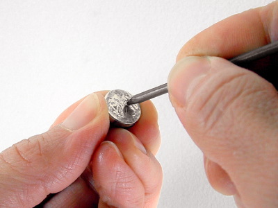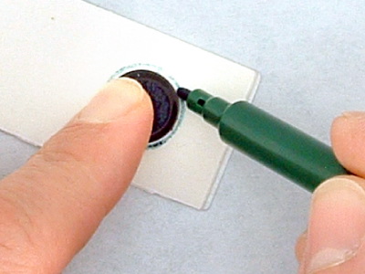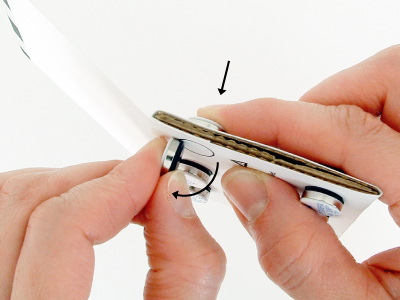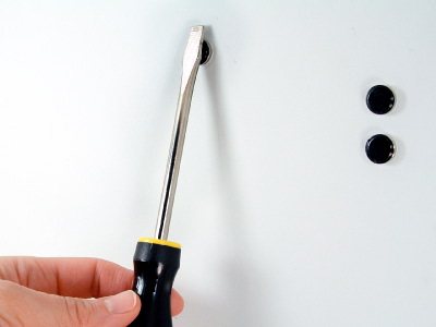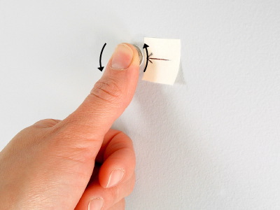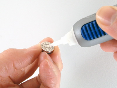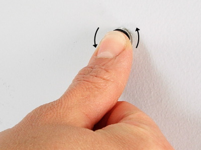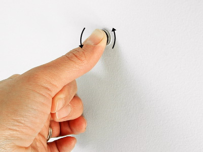 To remove a Tool Dot, support the Tool Dot on the back with your index finger preventing it from moving. (PIC 2-1) Roll the Tool Dot on the front up on end and grab it firmly with your thumb and index finger. (PIC 2-2) Set it on a table away from metal objects and other Tool Dots. Now grab the Tool Dot off the back firmly with your thumb and index finger. (PIC 2-3) Set it on a table at least 4 inches (10.2 cm) from the other Tool Dot. (PIC 2-4)