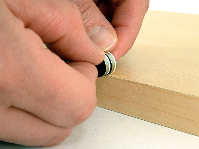 If two Tool Dots are stuck together it will be difficult to separate them. To separate Tool Dots, place the Tool Dots on an edge of a table so that one Tool Dot is hanging over the edge. (PIC 2-8) Push down with your thumb to slide or roll the Tool Dot off the other. (PIC 2-9) Grab each Tool Dot firmly with your fingers. (PIC 2-10)