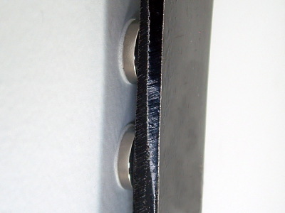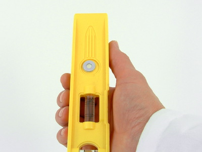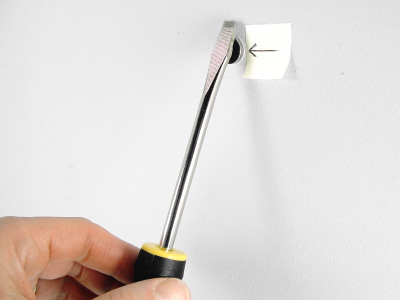 The Tool Dot has been tested to hold up to 1/2 lb (0.23 kgs) continuously with a symmetrically, balanced tool. (PIC 3-3) Heavier or odd shaped tools may not be held as well with a single Tool Dot. You can determine this by looking at the tool from the side. If the foam adhesive backing is sharply angled, then the tool is trying to pull the dot off the wall. (PIC 3-4) This may lead to premature failure. To fix this you need to distribute the weight across more Tool Dots. Add Tool Dots in strategic places to support the tool. (PIC 3-5)